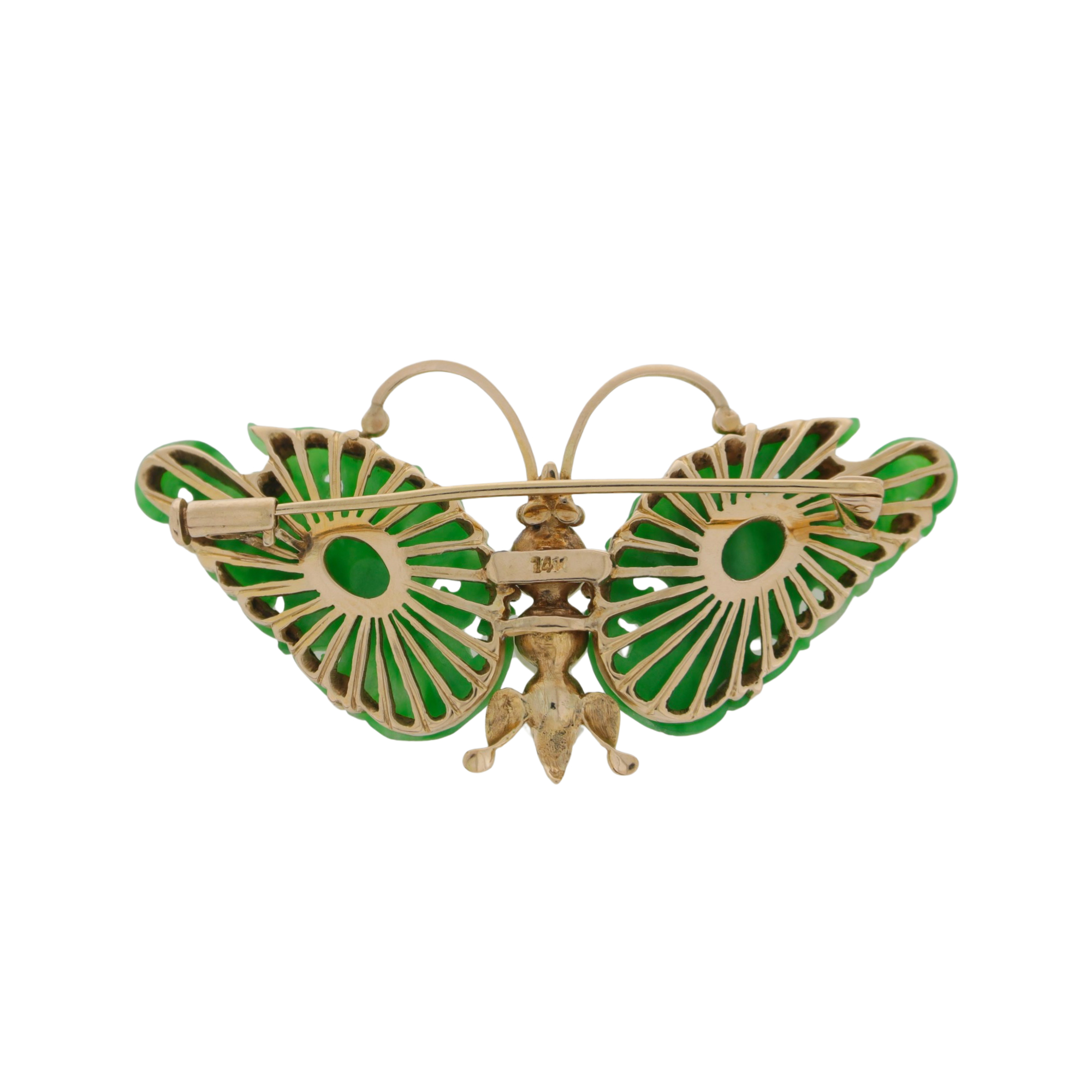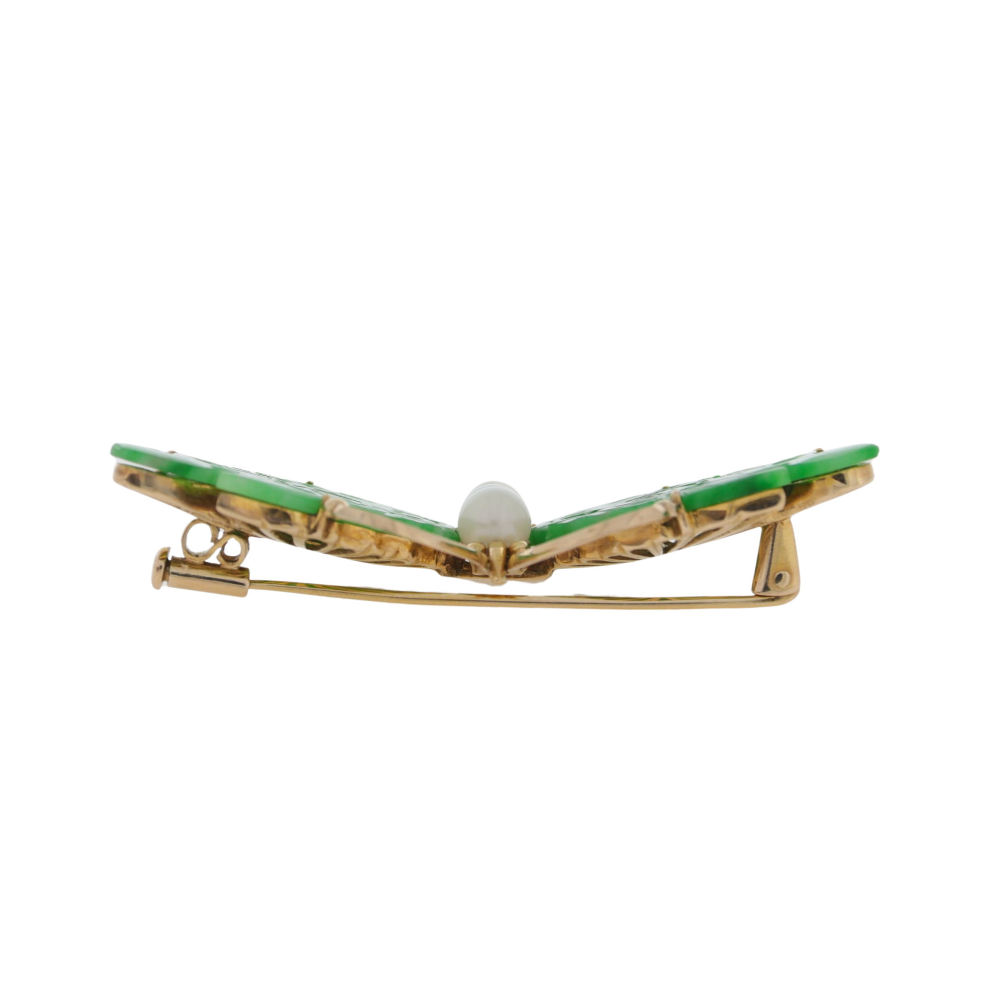 Carved jade and cultured pearl Butterfly brooch mounted in 14K gold