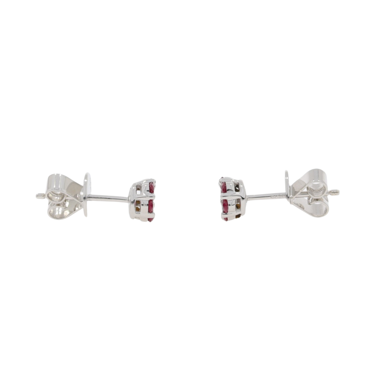 A timeless pair of ruby and diamond seven stone cluster earrings, with inverted effect. The modern brilliant cut diamond in the centre is surrounded by 6 round mixed cut rubies, all very well matched and bright and held in white gold claw settings. The earrings themselves are very neat and with a low profile to the ear. The mounting is all in 18ct white gold and secured with traditional post and butterfly fittings.