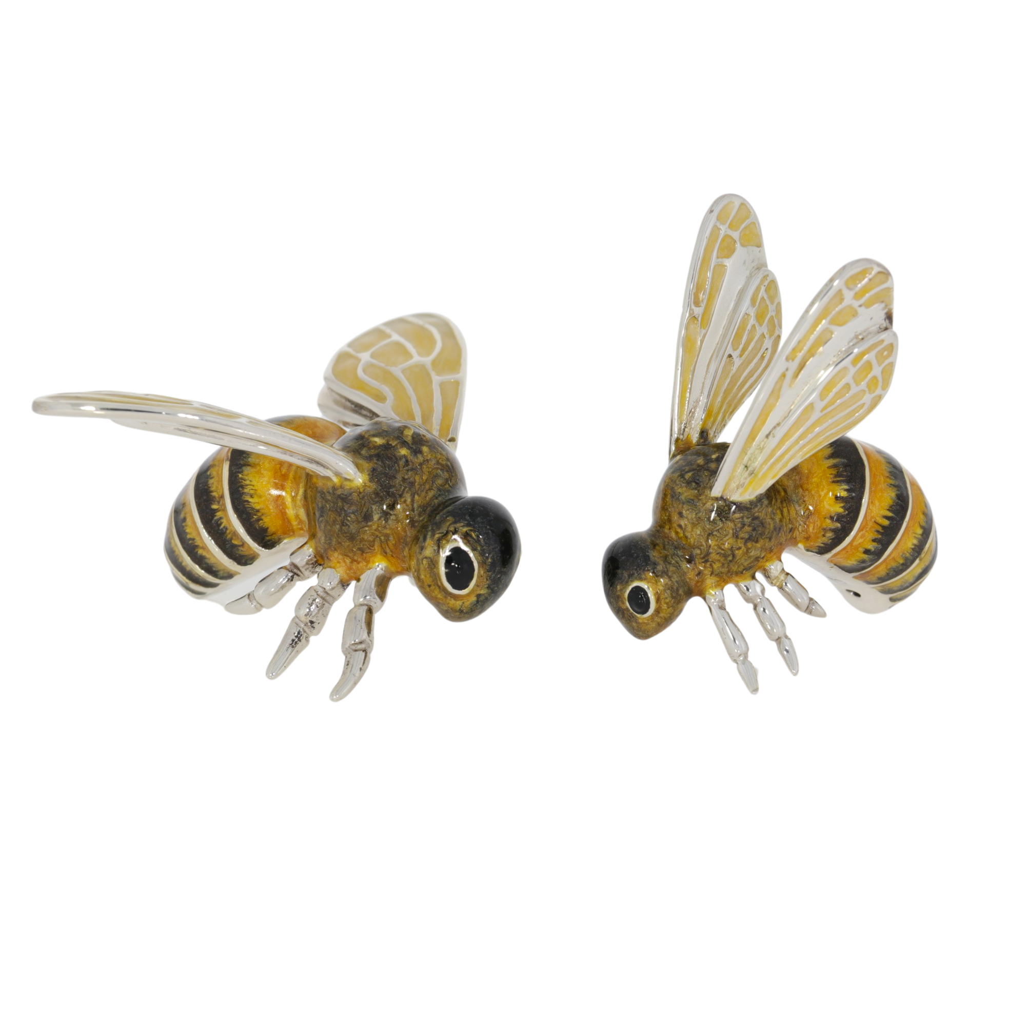 Sterling silver and enamel pair of large Bee ornaments by Saturno. With exquisitely fully enamelled head, body and wings, with very detailed yellow and black bands and wings inset with cream enamel on each panel.